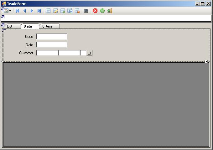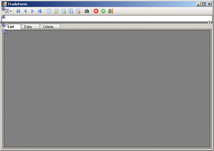 Build (Shift + F6) the project. Now if you double click on TradeForm in the Solution Explorer you will see the browse part of the form, that is something like the following.